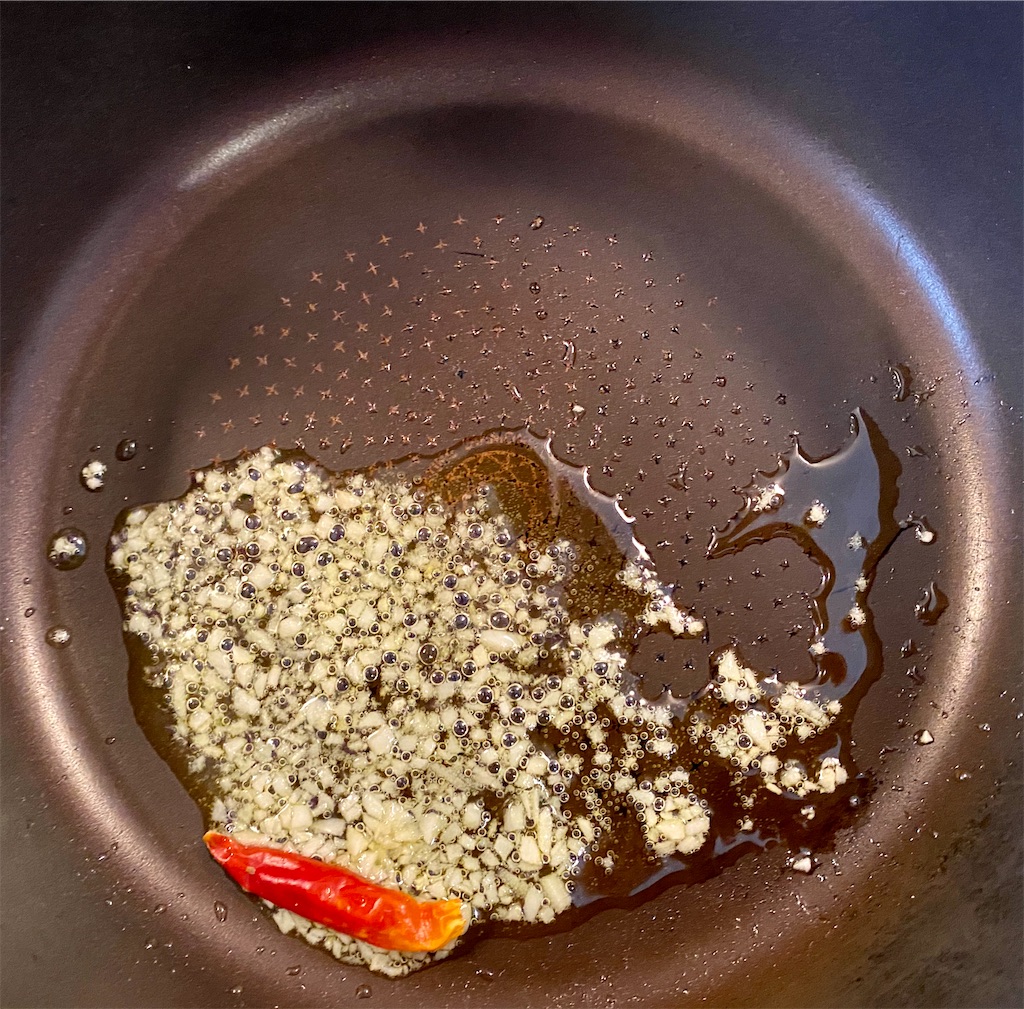 ここに"茹で汁+茹で上がったパスタ"を入れれば、普通にペペロンチーノが完成しますね!
