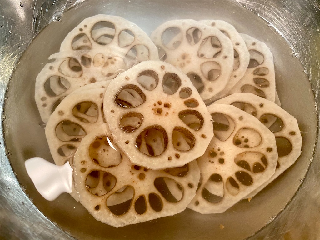 まずは蓮根をスライスして水につけます!