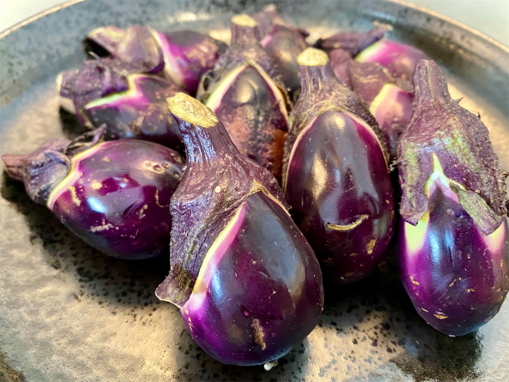半分にカットした"小茄子"を、切った面を下にして並べて炒めていきます!