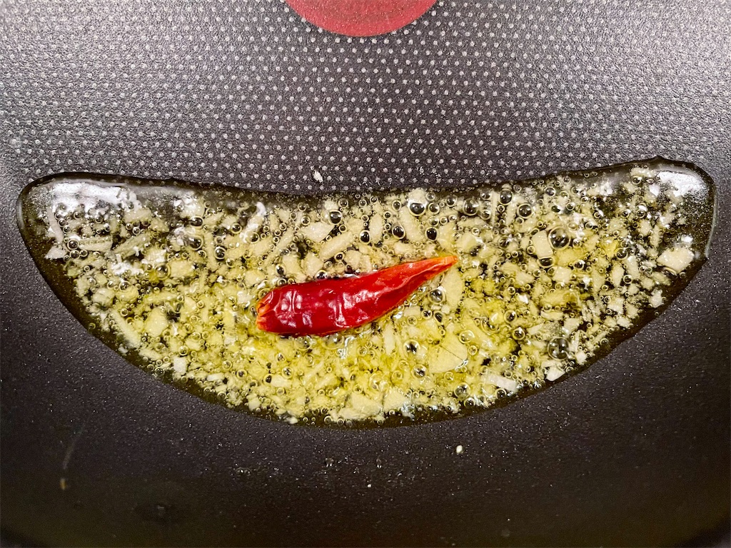香りが広がってきたら、フライパン全体に広げて、、、